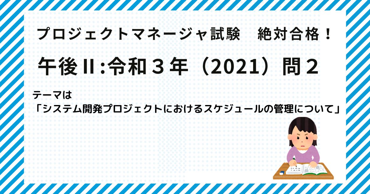 午前Ⅱ(論文)対策。実際の問題を使って、解法の流れを見てみましょう。今回は令和3年の秋試験からプロマネ午後Ⅱの問2でやってみます。