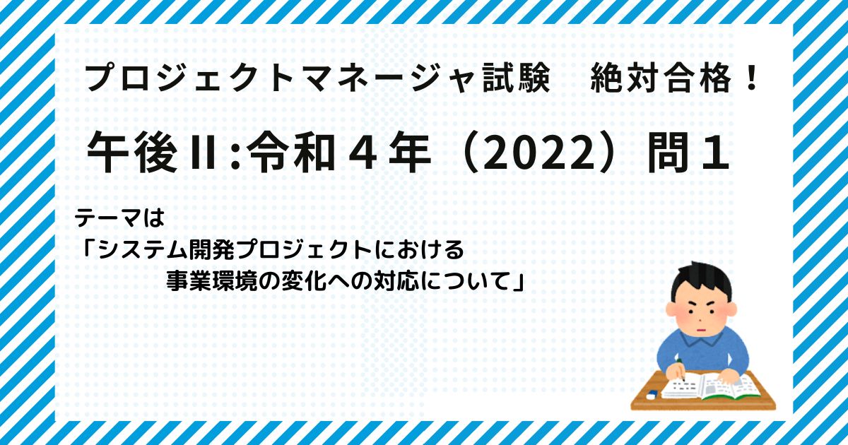 午前Ⅱ(論文)対策。実際の問題を使って、解法の流れを確認していきます。今回は令和4年(20222年)の秋試験から、プロマネ午後Ⅱの問1でやってみます。
