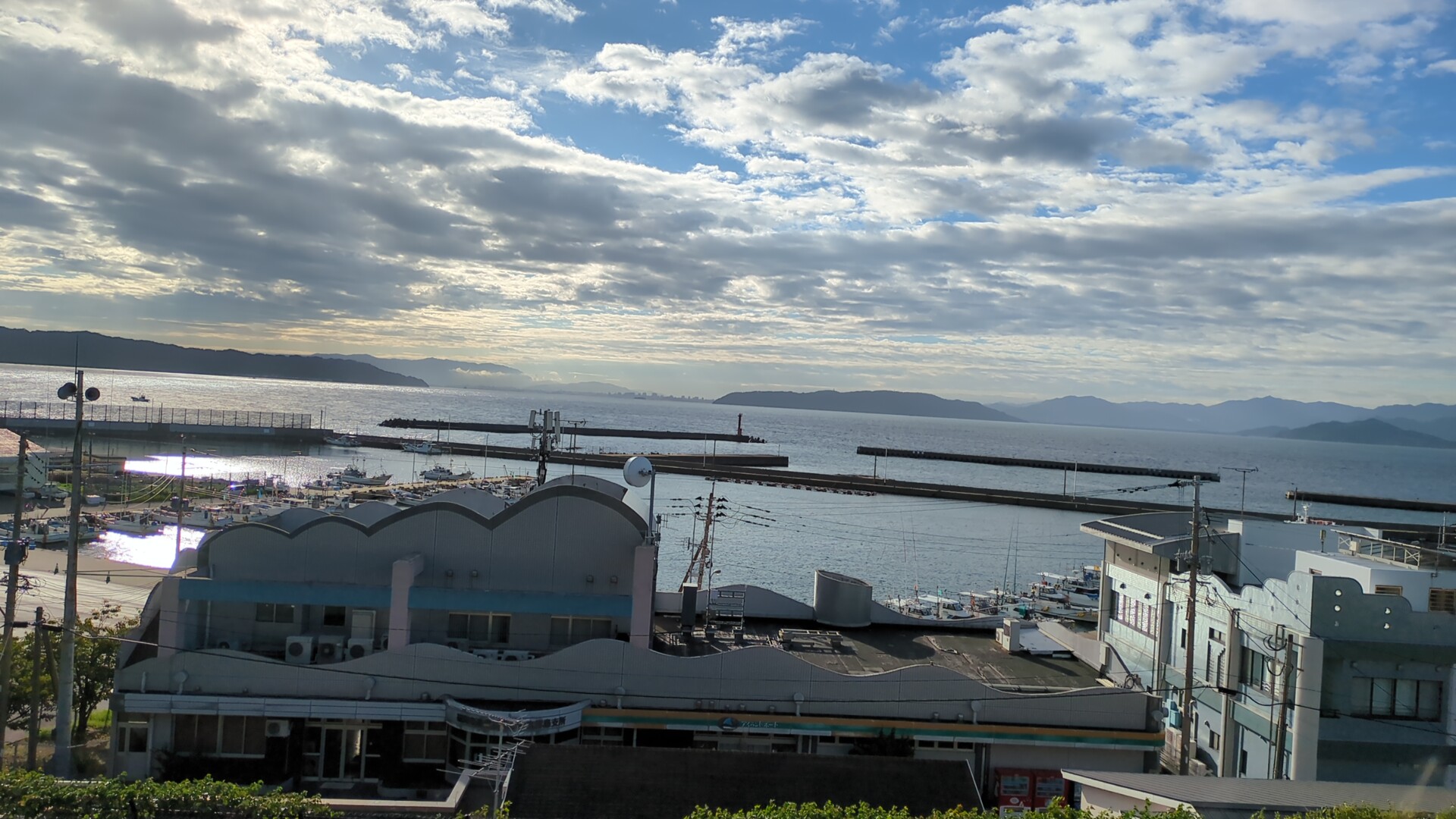 高台をあとにして、ゆっくりと坂を下りながら港の方へ向かいます。朝の空気は澄んでいて、潮の香りが心地よく漂ってきました。港沿いを歩いていると、数人のおじいさんたちがベンチに腰を下ろし、のんびりと海を眺めたり、言葉少なに談笑したりしていました。