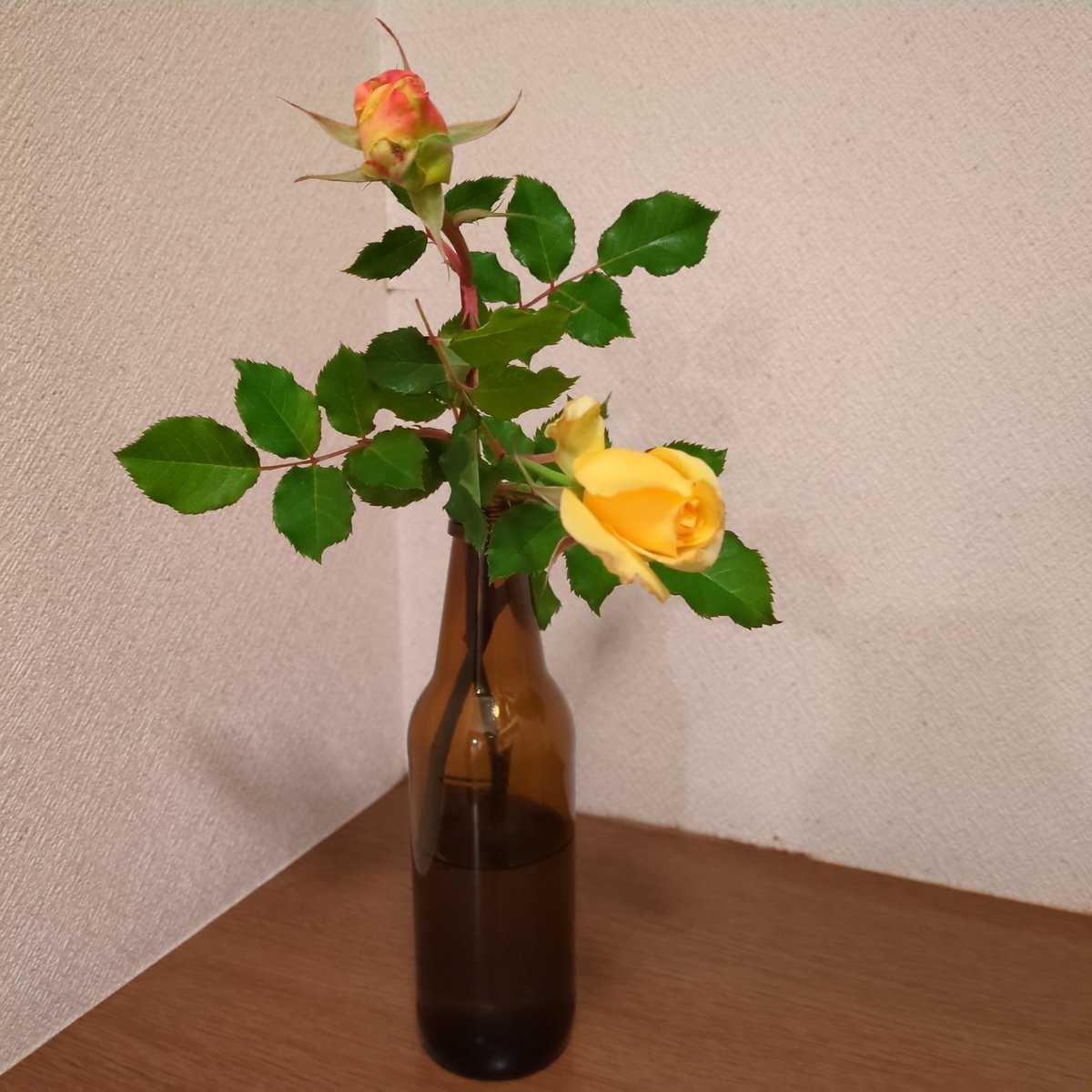 正月からセンリョウ、そして季節外れの薔薇とかざりました。およそ月に2回かな、今後も続けよう。